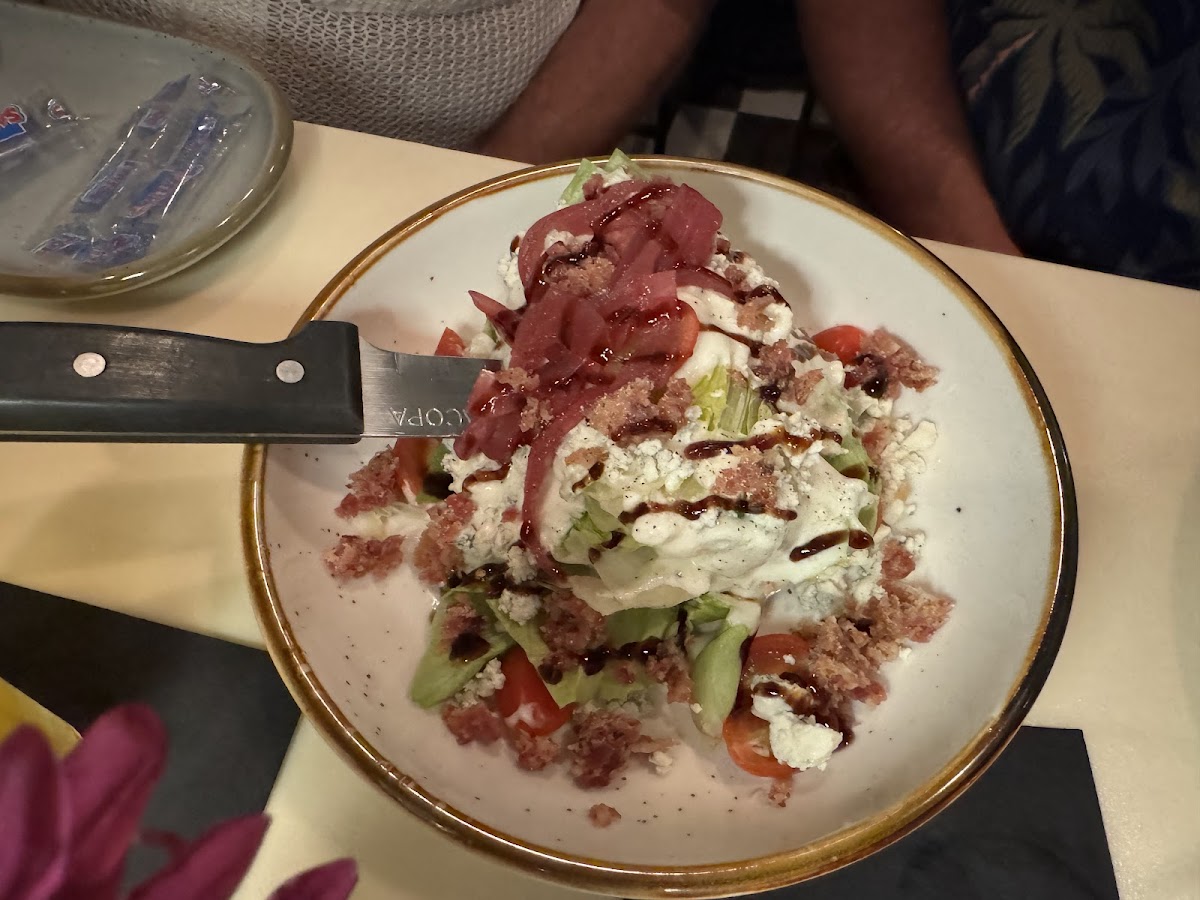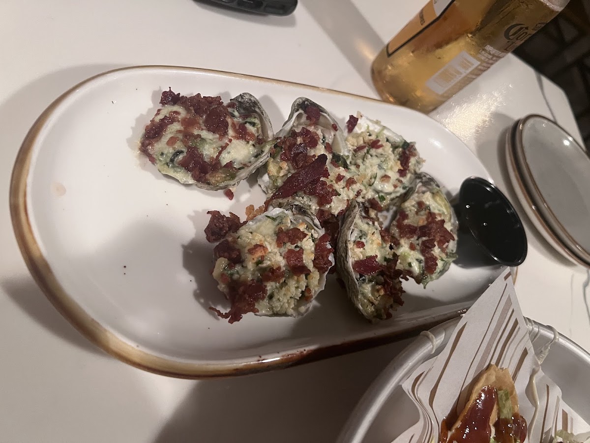 For those who enjoy a good salad, the Wedge Salad is a must-try. Topped with crispy bacon, tangy blue cheese, and a delicious dressing, it’s a refreshing option that’s both satisfying and light. Seafood lovers won’t be disappointed either. The Oysters Rockefeller is a standout dish, offering a rich, creamy flavor that perfectly complements the fresh oysters. And if you're looking for something to snack on while you enjoy the cozy atmosphere, the Bayside Nachos are a great choice. Loaded with cheese, salsa, and all the fixings, these nachos are perfect for sharing.
